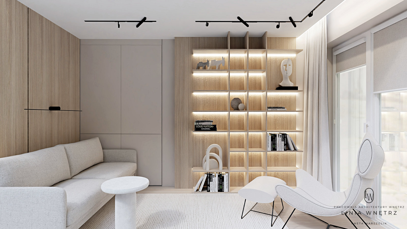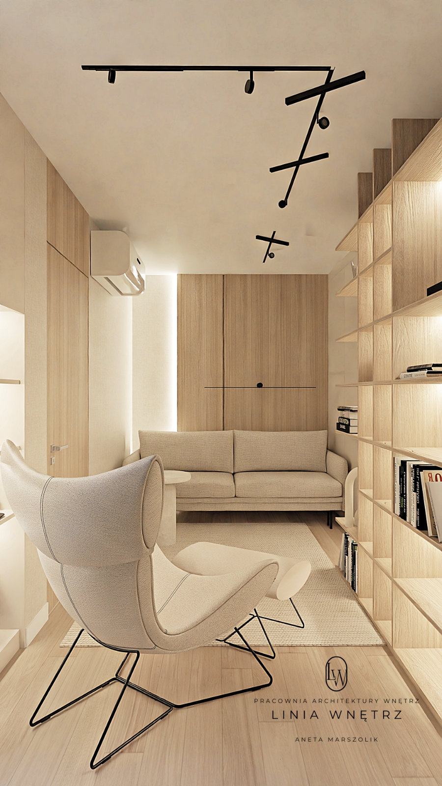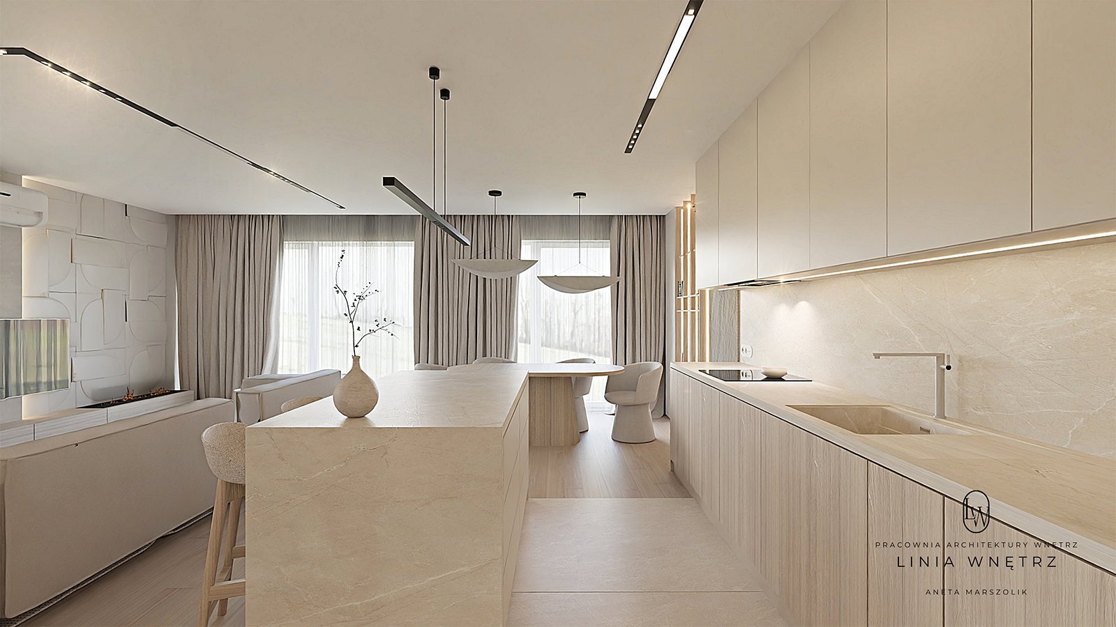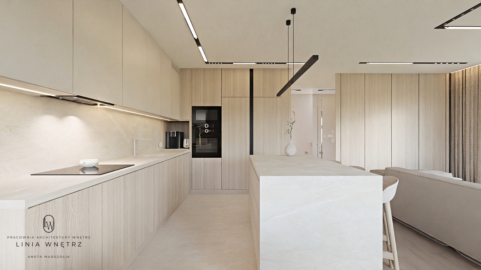 Wnętrze w jasnej tonacji, w stylistyce łączącej styl japandi oraz eco w nowoczesnym wydaniu. Przeważają powierzchnie drewniane oraz kamienne, dopełnione czernią. Powstałe wnętrze jest harmonijne i przytulne, przywodzi na myśl naturę i świeżość.