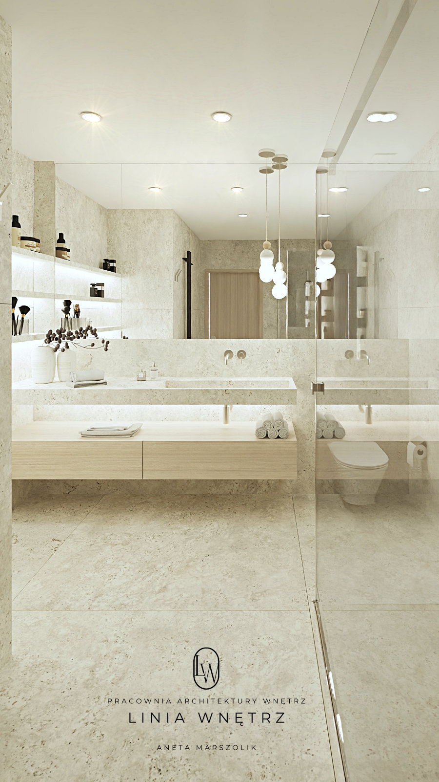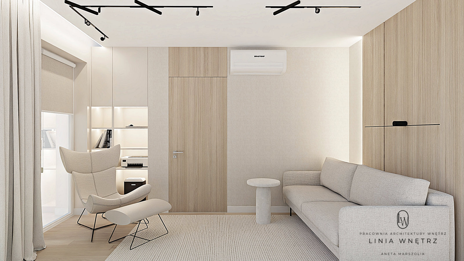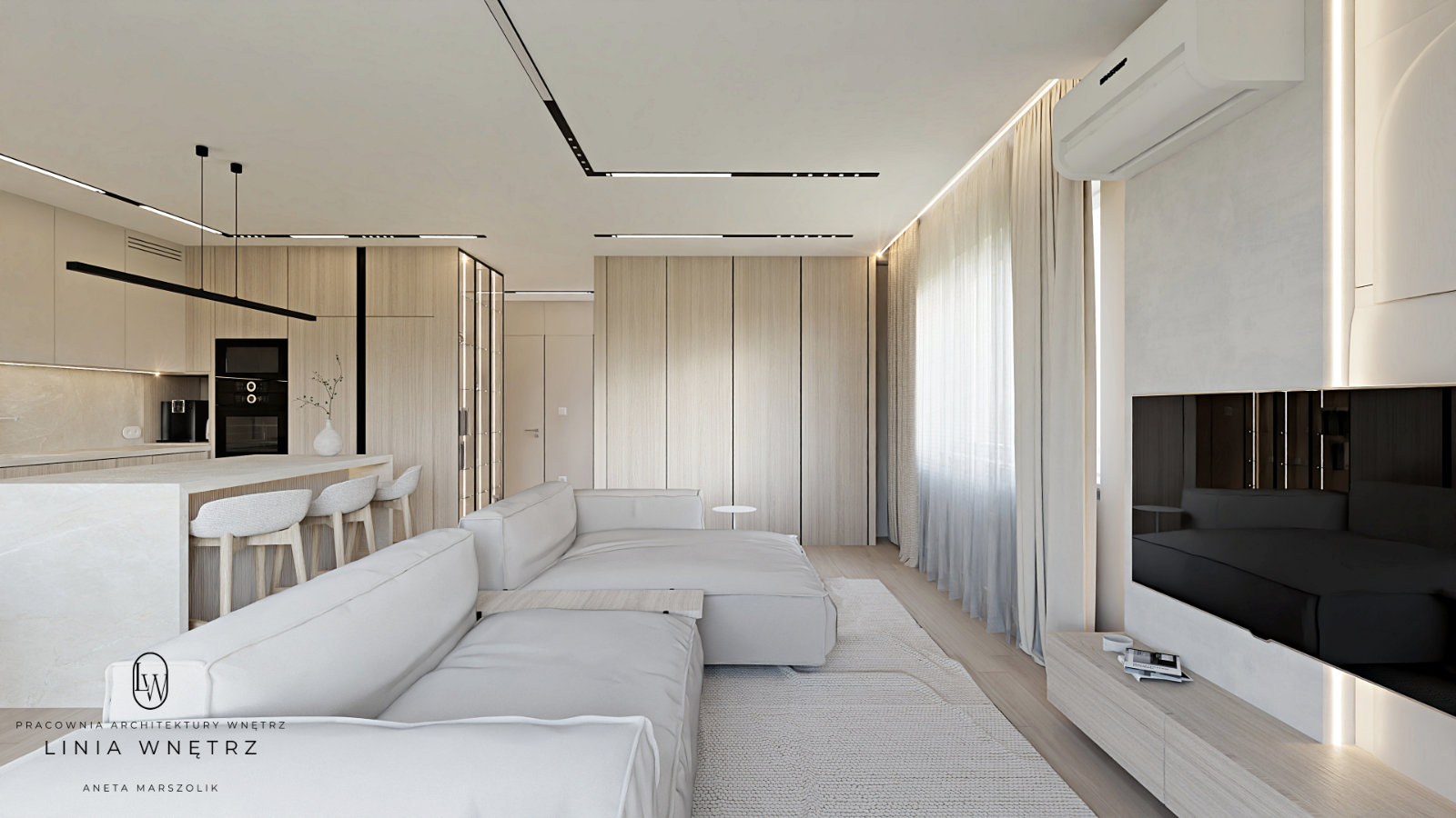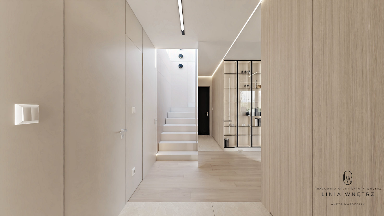 Wnętrze w jasnej tonacji, w stylistyce łączącej styl japandi oraz eco w nowoczesnym wydaniu. Przeważają powierzchnie drewniane oraz kamienne, dopełnione czernią. Powstałe wnętrze jest harmonijne i przytulne, przywodzi na myśl naturę i świeżość.