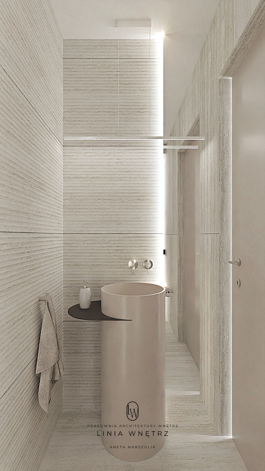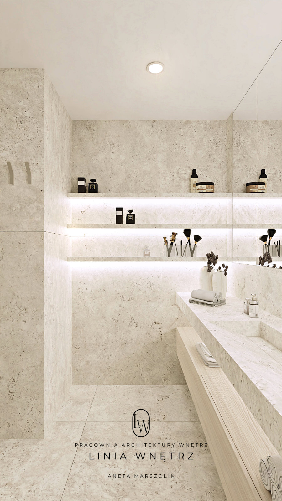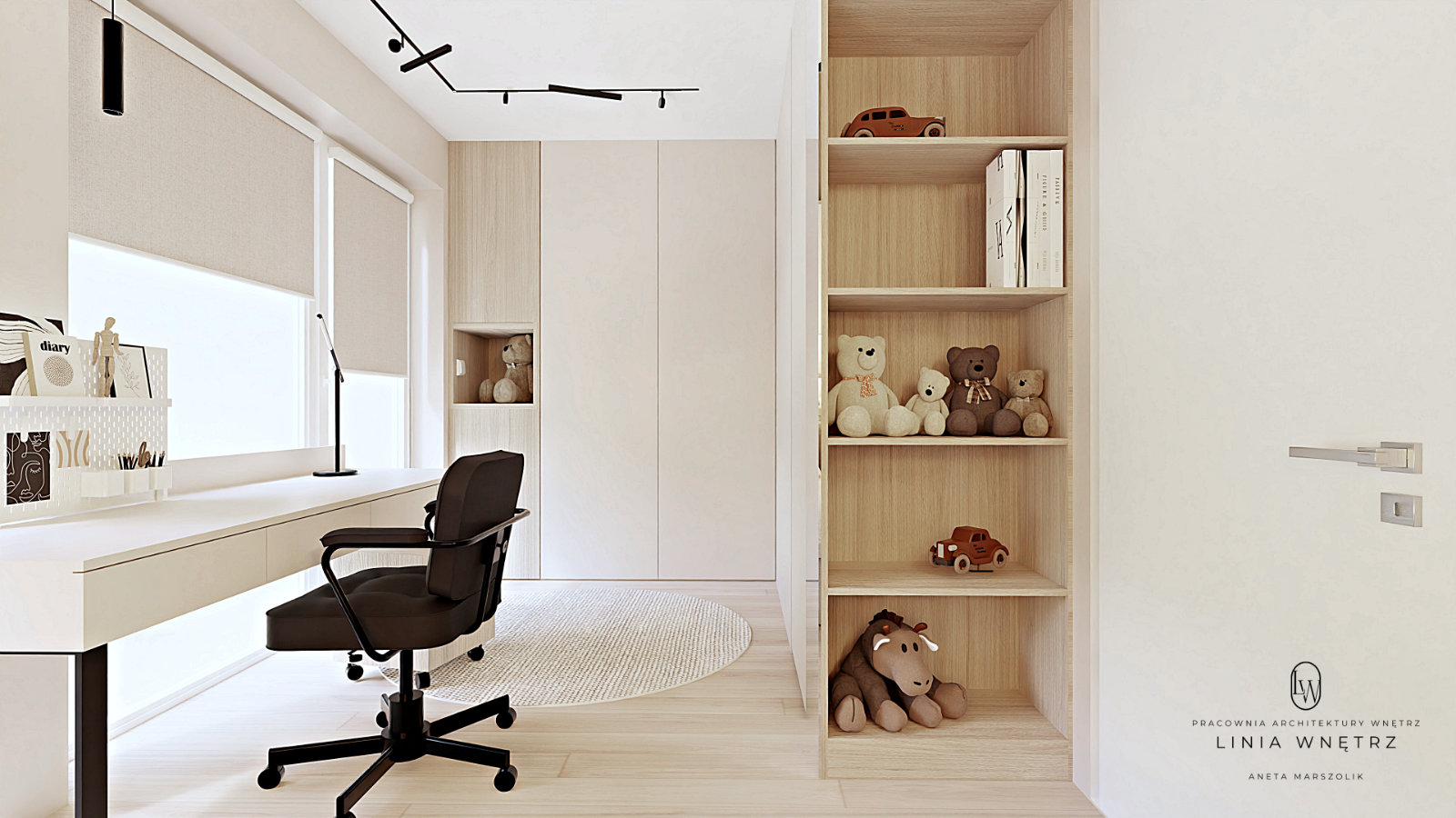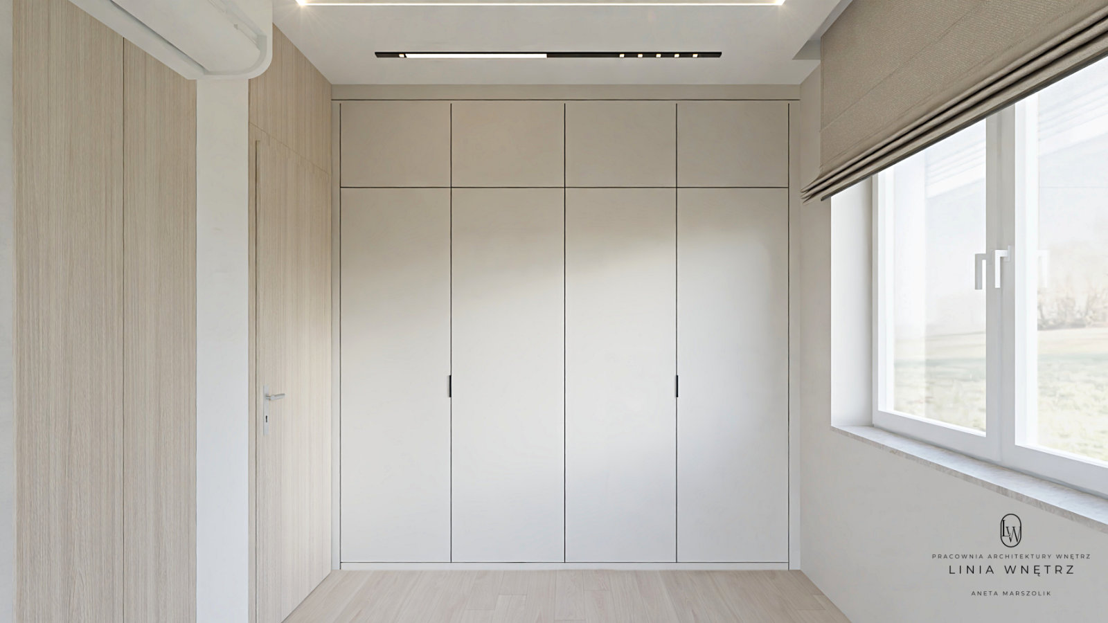 Wnętrze w jasnej tonacji, w stylistyce łączącej styl japandi oraz eco w nowoczesnym wydaniu. Przeważają powierzchnie drewniane oraz kamienne, dopełnione czernią. Powstałe wnętrze jest harmonijne i przytulne, przywodzi na myśl naturę i świeżość.