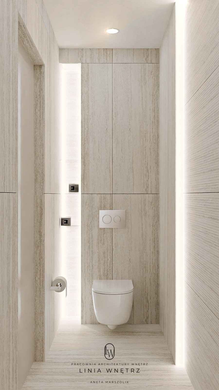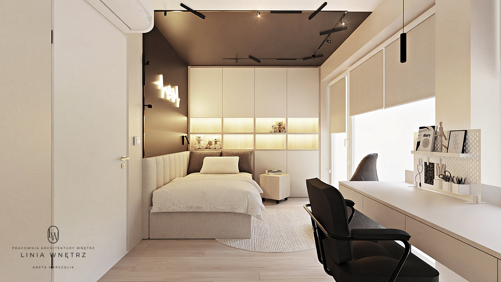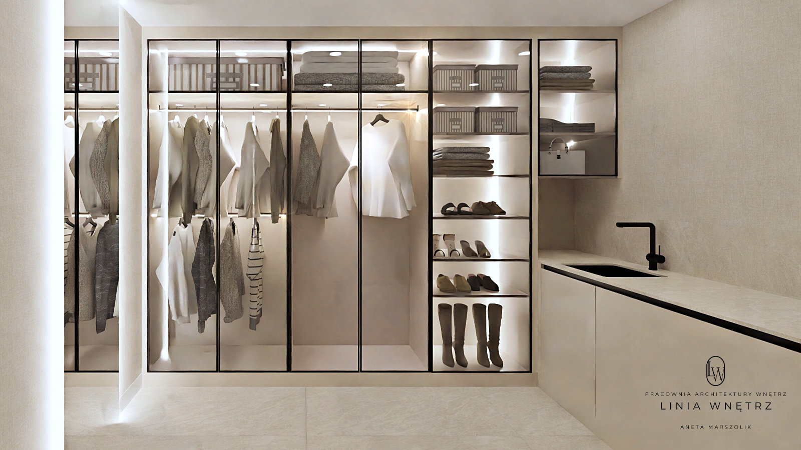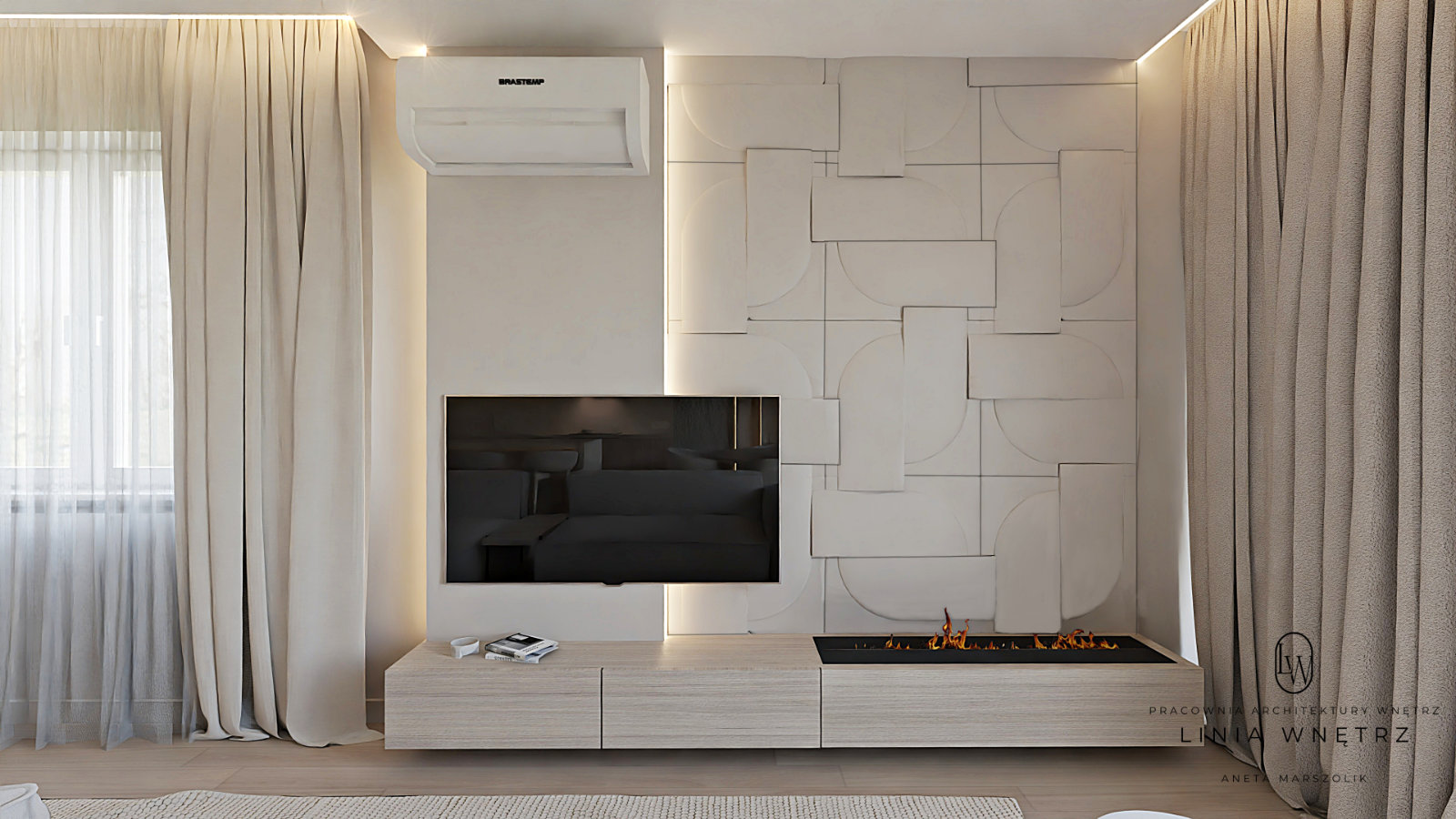 Wnętrze w jasnej tonacji, w stylistyce łączącej styl japandi oraz eco w nowoczesnym wydaniu. Przeważają powierzchnie drewniane oraz kamienne, dopełnione czernią. Powstałe wnętrze jest harmonijne i przytulne, przywodzi na myśl naturę i świeżość.