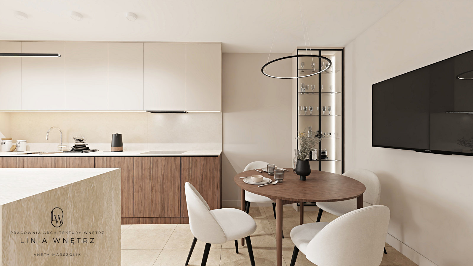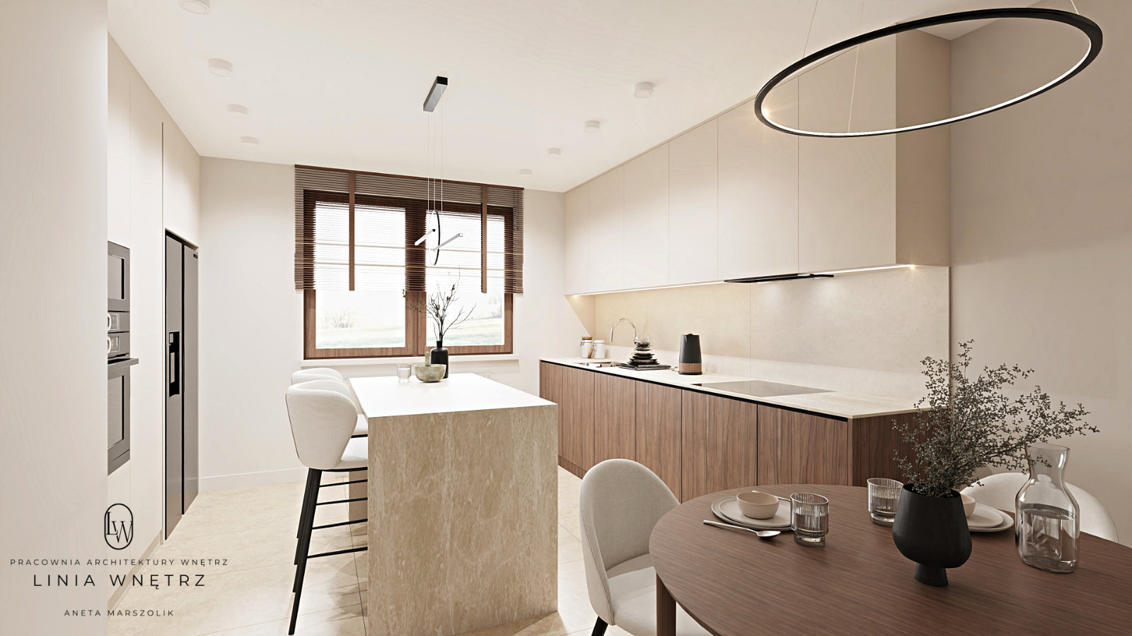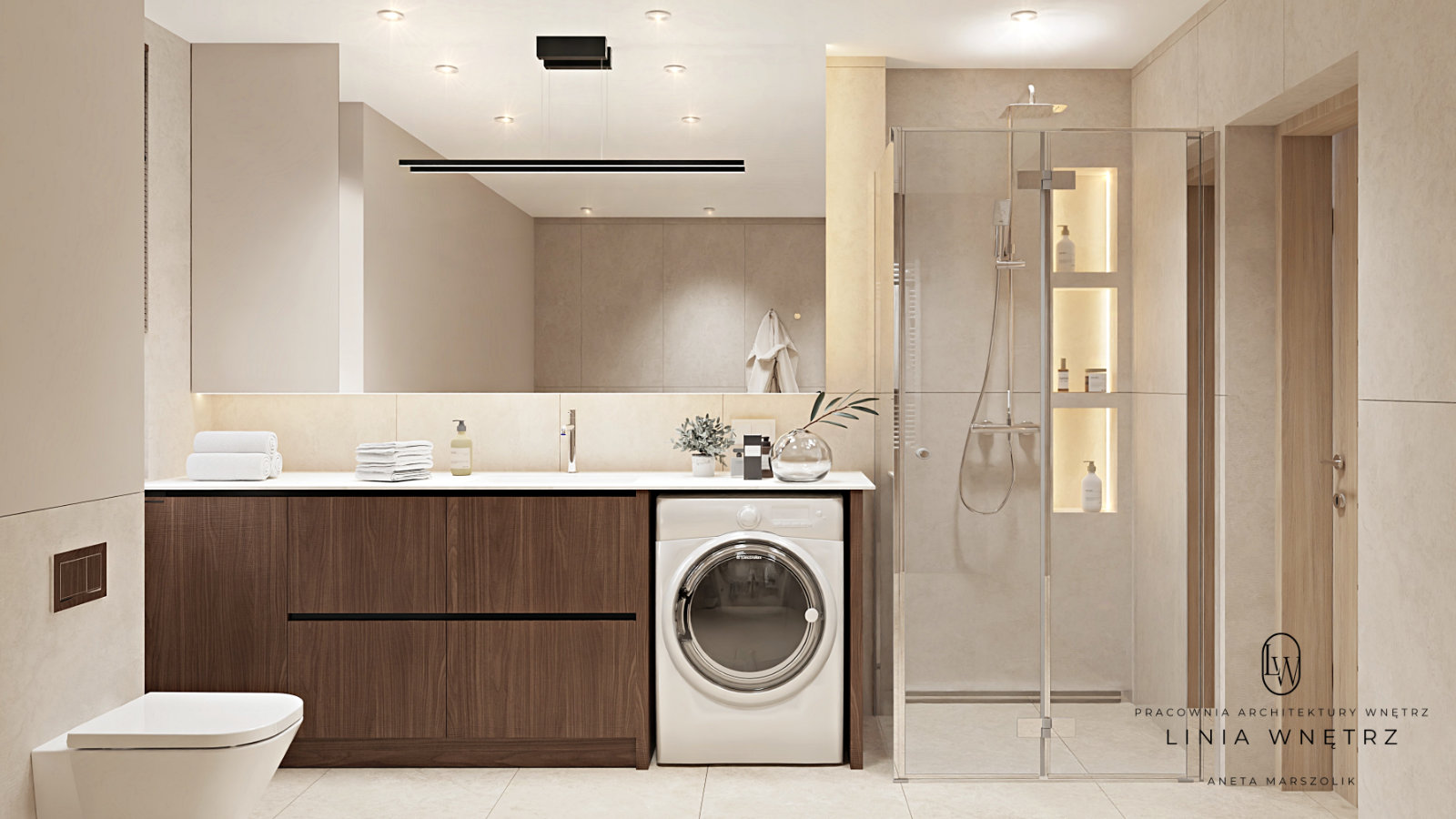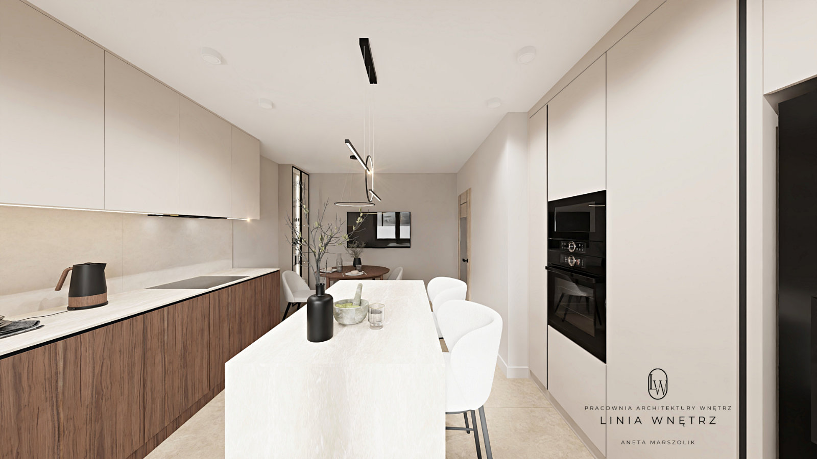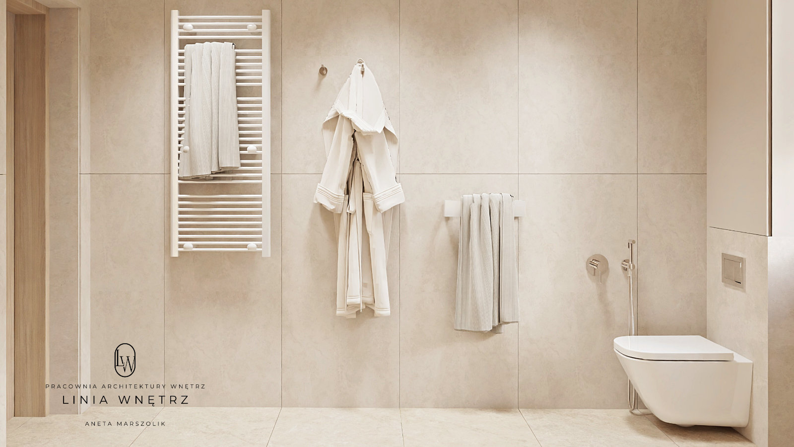 Przytulne wnętrza pełne ciepła beżu, subtelności rysunku drewna i miękkości kaszmiru okazały się być spełnieniem marzeń Inwestorów. Płytki z kamiennym wzorem dodatkowo wprowadzają lekko naturalny, spokojny klimat, natomiast czarne detale i akcentujące oświetlenie podkreślają piękno projektu. Wnętrza są nie tylko piękne, ale i funkcjonalne, wykorzystując przestrzeń  optymalny sposób i zapewniając mnóstwo pojemnych szafek do przechowywania.